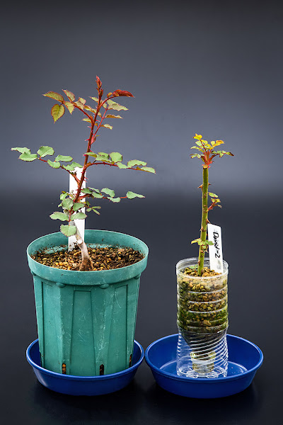 この2本もHTで、"ジェミニ" と "ダイアナ" です。上の3品種と異なるのは、挿し穂が秋に出たシュートで若い葉が残っていること。新根の長さは同程度ですが、葉柄が残っていると新葉の展開は遅くなるようです。でも新芽は勢いがあります。